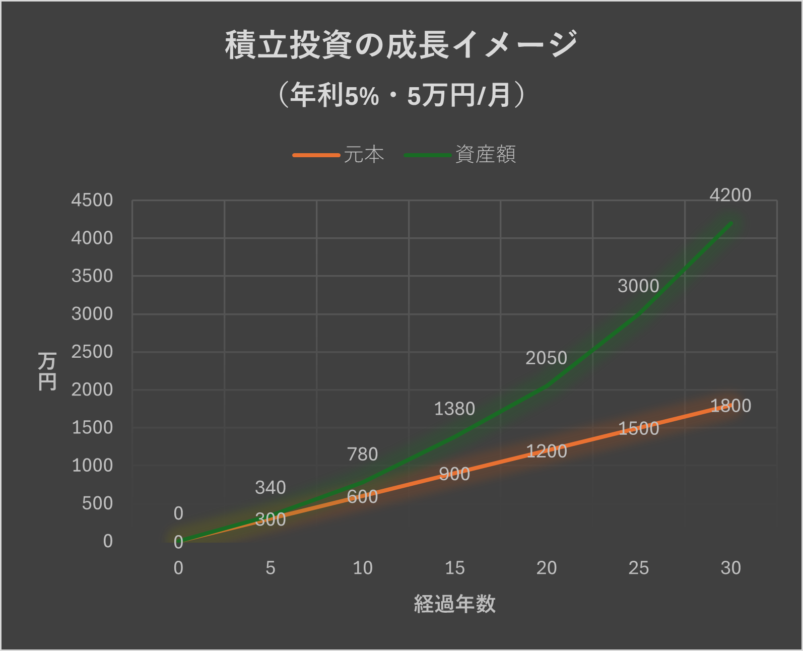 例えば、月5万円を年利5%で運用した場合のシミュレーションは以下の通りです。